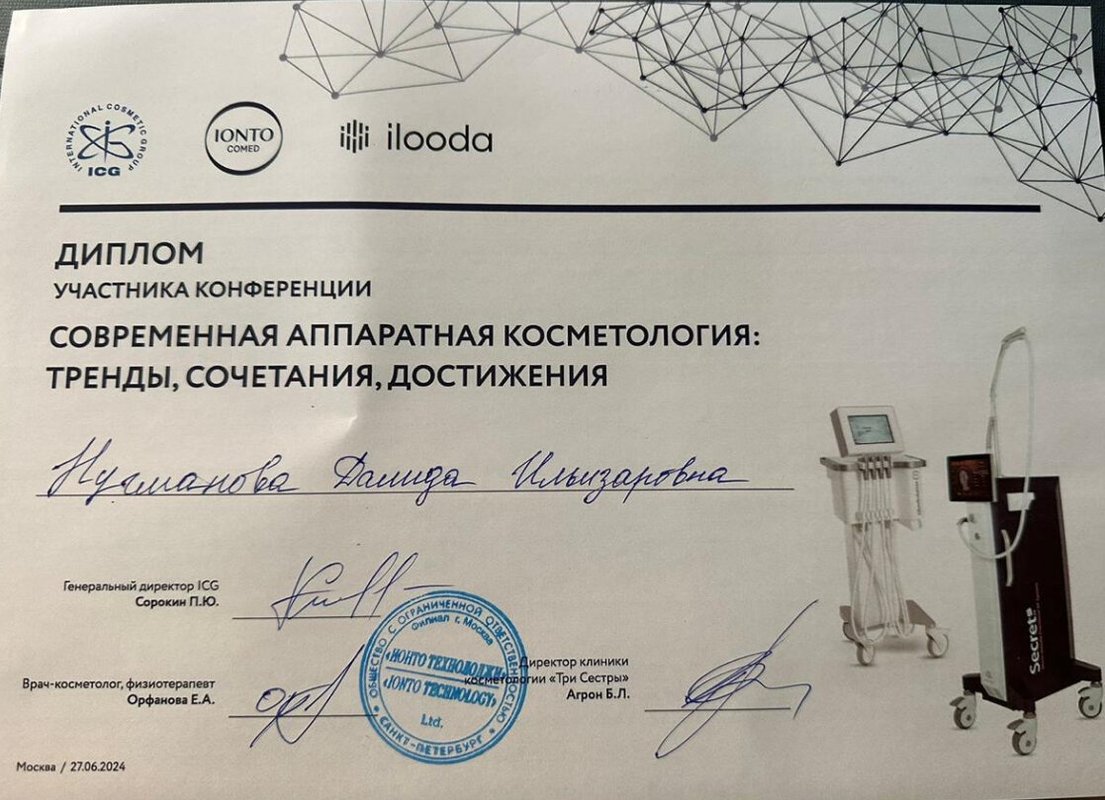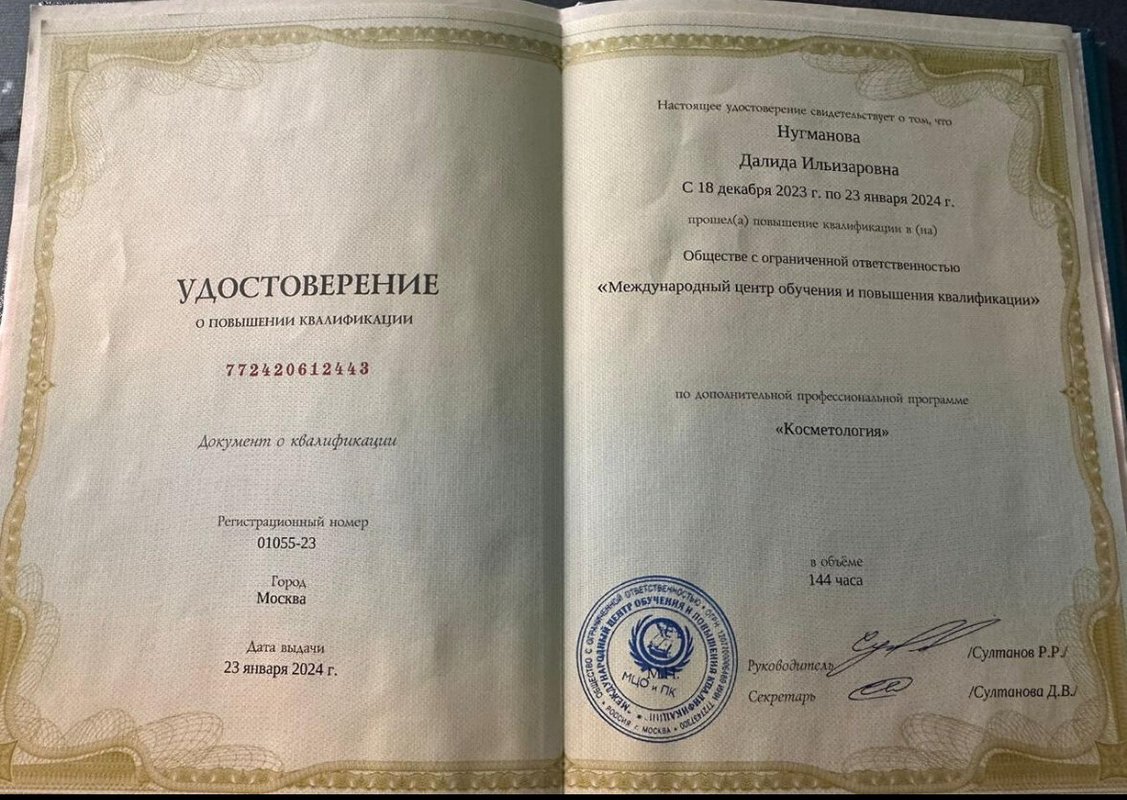Огромное спасибо говорю хорошему доктору, прекрасному человеку и красивой женщине Дарье Ильизаровне за ее профессионализм, умение делать нас ухоженными, красивыми, уверенными в себе! В течении трех лет при любом приезде в Москву обязательно ее посещаю с удовольствием!!!